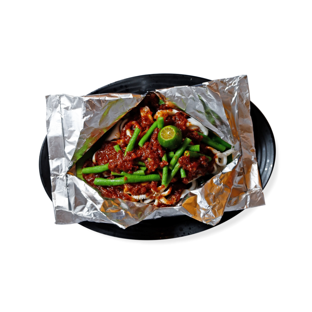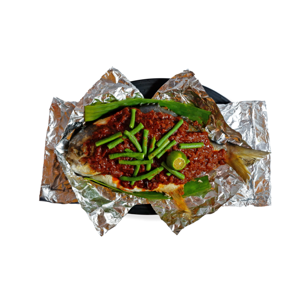 Enjoy our Ikan Bawal Bakar with nyonya samba. Whole golden basal wrapped in banana leaves baked in special spicy Nyonya sauce topped with beans.